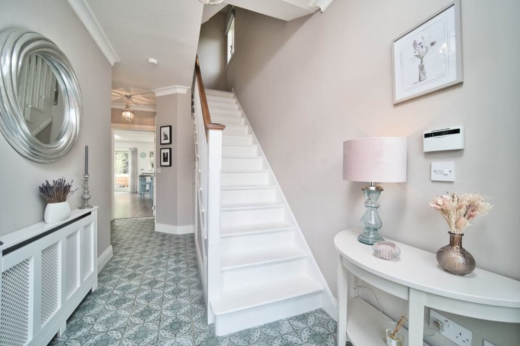 Entrance Hallway 5.35m x 2m Tiled flooring, coving, light fittings, under stair storge, radiator cover and alarm panel.