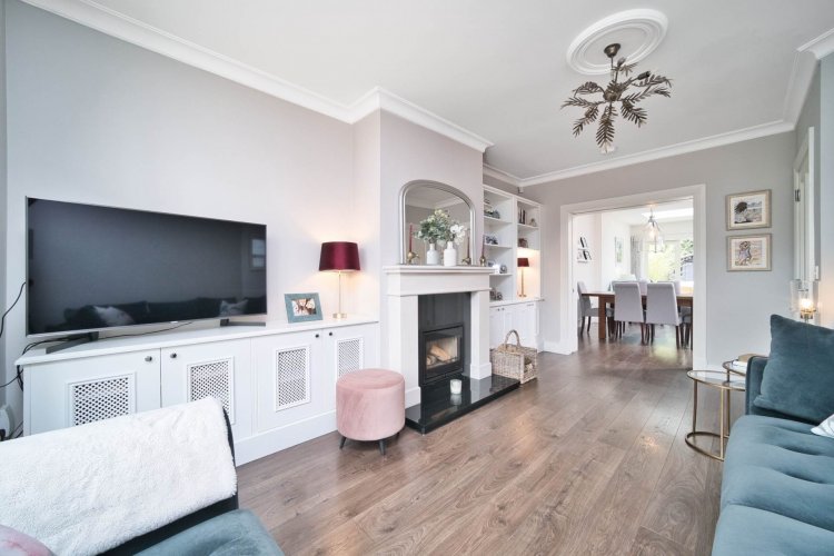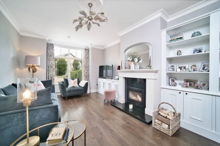 Living Room 5.7m x 3.5m Pocket sliding doors, laminate wood flooring, feature fireplace with wood burning stove and granite hearth, Custom built TV unit and bookshelves, radiator cover unit, coving, blinds and light fitting.
