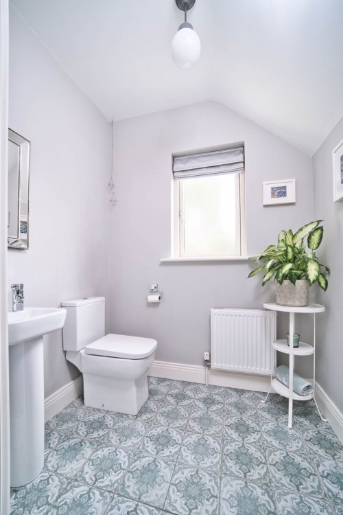 Guest W.C. 1.47m x 1.81m Tiled flooring, w.c., w.h.b., light fitting, extractor fan and roller blind.