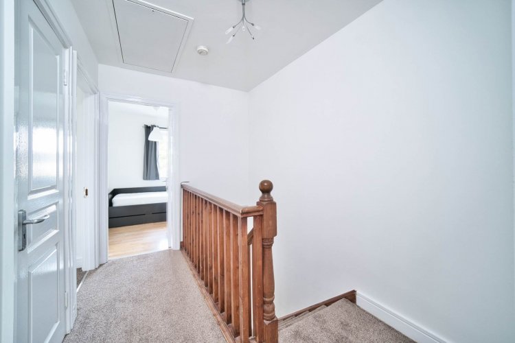 Landing 2.1m x 2.95m Carpet, hot-press, light fitting and attic access with folding ladder.