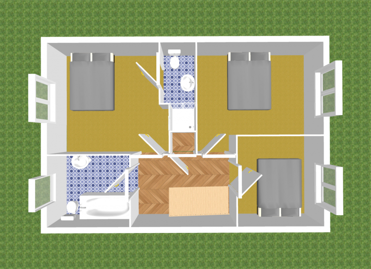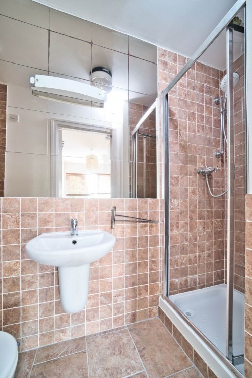 Ensuite 1m x 2.5m Fully tiled, shower cubicle, w.c., w.h.b., mirror with shaving light, light fitting and extractor fan.