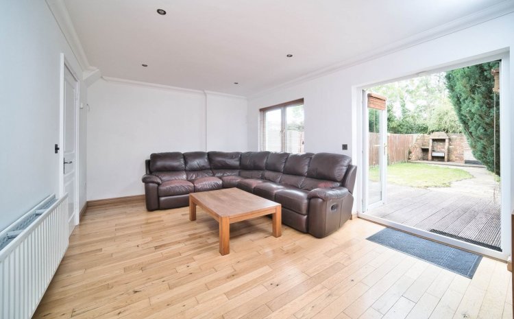 Living Room 3.47m x 5.37m Oak wood flooring, feature red brick fireplace with electric fire insert, TV point, coving, recessed lights and double doors leading out to garden.