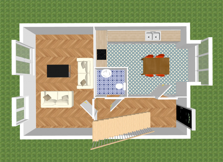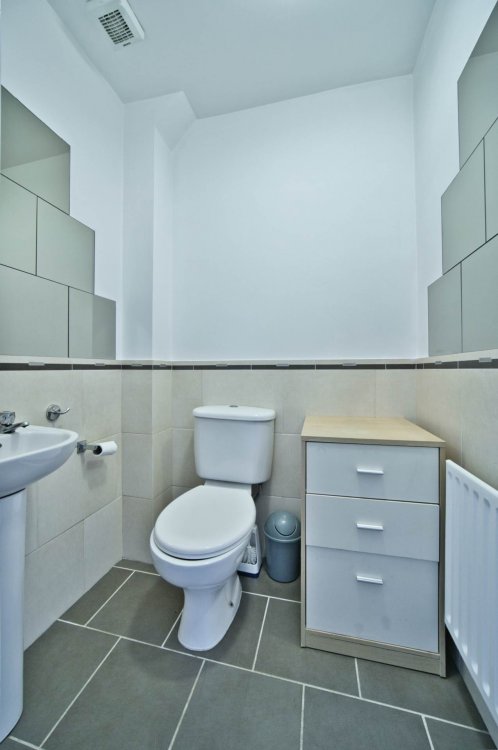 Guest W.C. 1.31m x 1.47m Tiled flooring, semi tiled walls, w.c., w.h.b., mirror, light fitting and extractor fan.