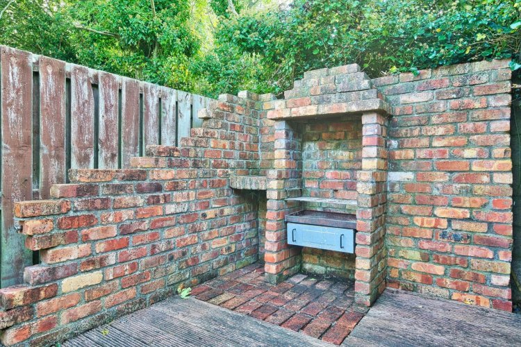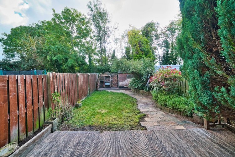 Garden 14m x 5.5m South facing garden with decking and lawn area, slabbed walkway to barbecue area, mature tress and planting.