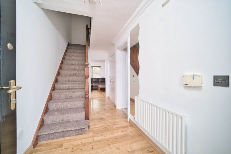 Entrance Hallway 4.7m x 1.85m Oak wood flooring, carpet up the stairs, coving, light fitting, storage closet and alarm panel.