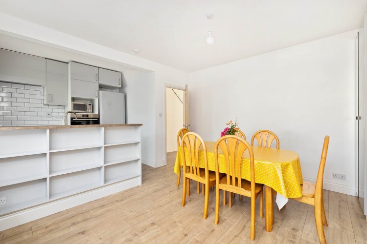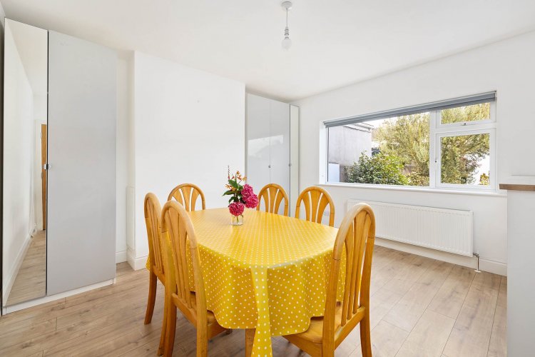 Kitchen/Dining 5.83m x 3.85 Laminate flooring, fitted wall and floor high gloss units, instant hot water system under sink, dishwasher, oven, hob, extractor fan, microwave, fridge freezer, washing machine and door leading to rear garden.