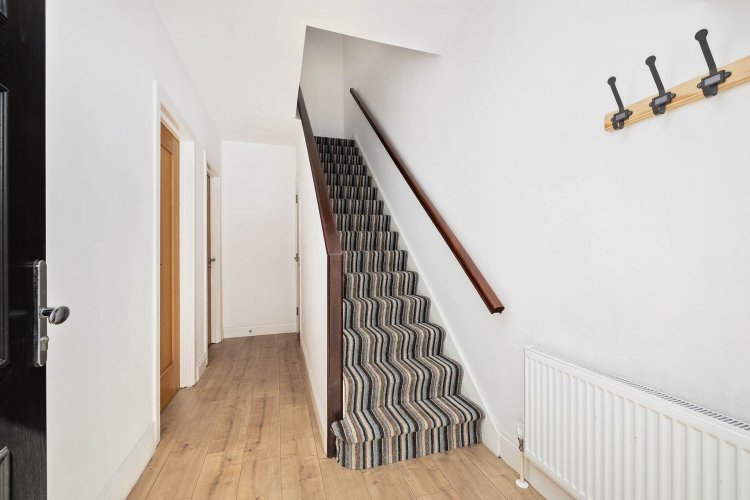 Entrance Hallway 5.19m x 1.81m Laminate flooring and light shade.