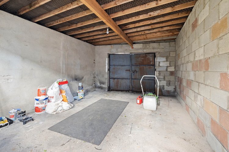 Garden 13.5m x 6m West facing year garden with block built garage and rear access to lane