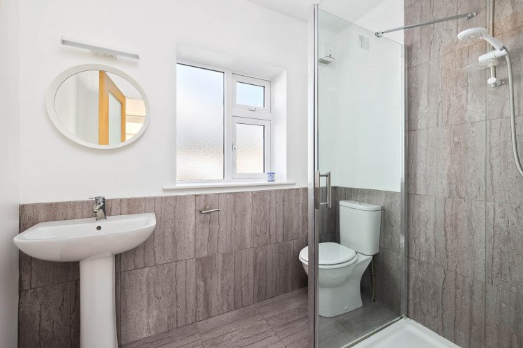 Bathroom 1.57m x 2.28m Tiled flooring, semi tiled walls, shower cubicle with Triton T90 electric shower, w.c., w.h.b., fitted mirror and shaving light.
