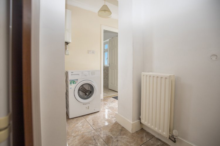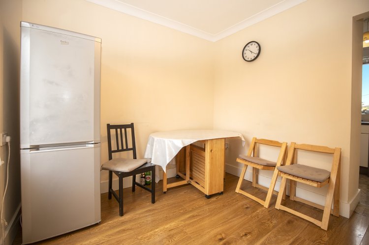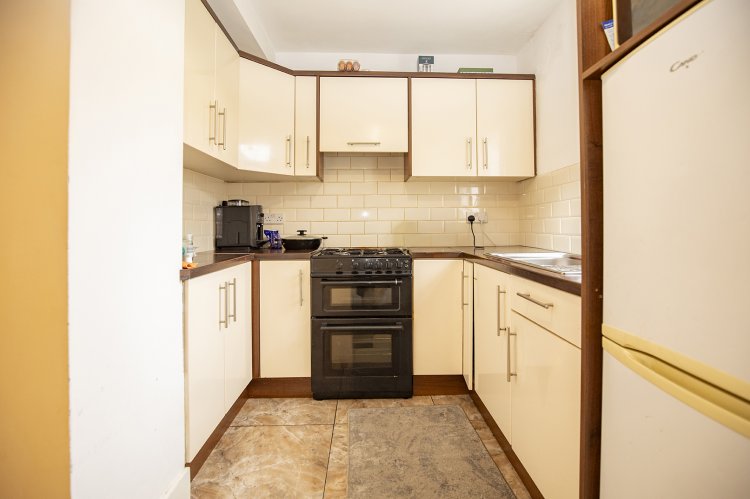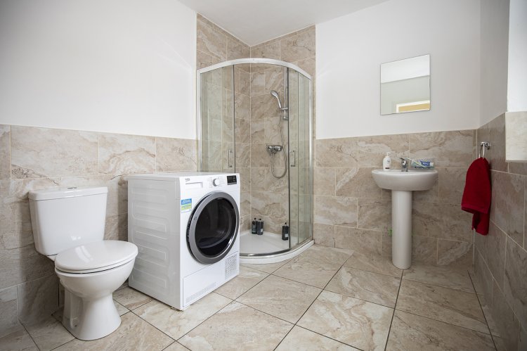 Moving through the dining area, you will enter the fully equipped kitchen, which is fitted with modern appliances and boasts a functional layout. The kitchen features laminate cream cabinetry, providing ample counter space for meal preparation and room for additional design and personal touches. With its stone-style tiled flooring, the space offers a fresh and contemporary feel, while practical and versatile enough to meet the needs of everyday living. This same tiled flooring extends into the ground floor bathroom, where you’ll find a partially tiled wall and a shower suite. The bright white colour scheme in this room further adds to the sense of space and openness, creating a light and airy retreat.
