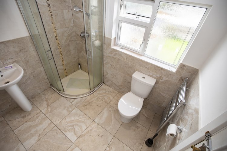 The main bathroom on this floor is a continuation of the thoughtful design, with fully tiled flooring, a partially tiled wall, and a shower suite. A large window provides ample natural light, making the room feel fresh and well-ventilated.