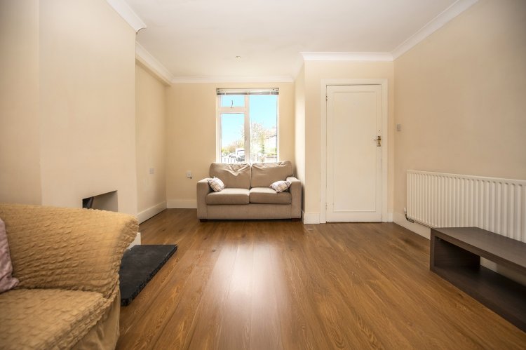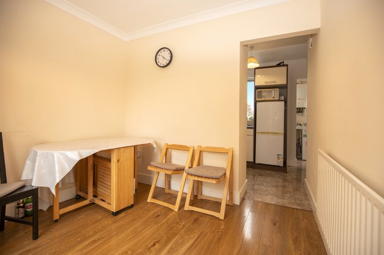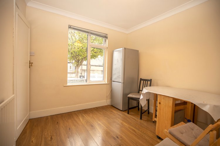 Upon entering, viewers will immediately be struck by the large living area, which boasts a soft cream colour palette that enhances the sense of space. The large windows flood this superb room with natural light by a dual aspect, creating a warm and inviting atmosphere. The room's brightness is further amplified by the high ceilings and the decorative coving, which speaks to the attention to detail in the home’s original design. The airy ambiance is perfect for both day-to-day living and hosting guests.