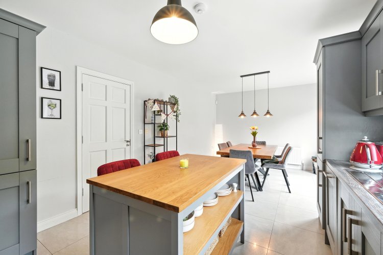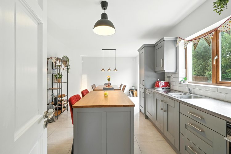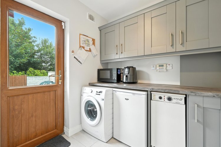 Finished with tiled flooring, fully fitted units, and houses the oil fired central heating. Downstairs WC off and door off to the back yard. |