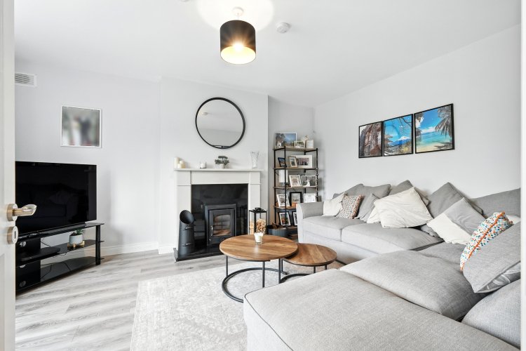 A bright spacious room, finished with laminate wood flooring and has an open fireplace with a fitted insert stove. |