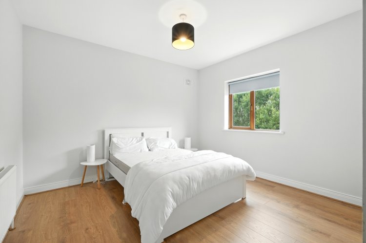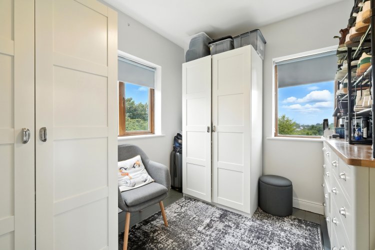 This bedroom features timber flooring and windows on both gable walls, allowing for an abundance of natural light. It enjoys a high level of privacy, overlooking a green area to the side and the rear garden. The room benefits from a south and west-facing aspect. |