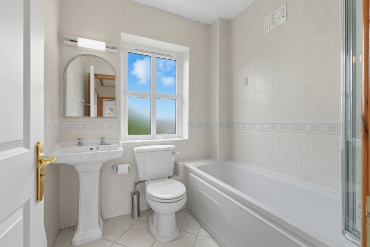 Fully tiled. Includes WC, WHB and bath. There is a glazed fold back shower door along the side of the bath. |