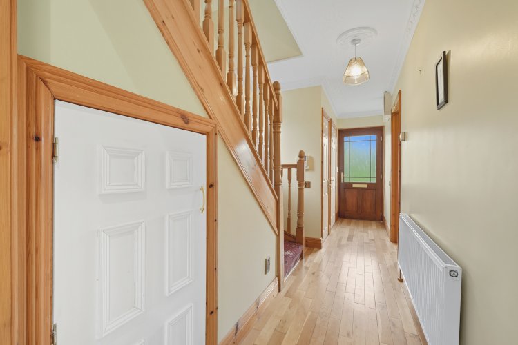 Finished with solid wood flooring. This entrance hallway has a ground floor WC off and a room plumbed for the washing machine. |