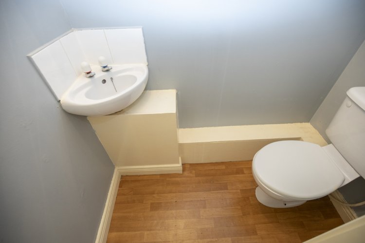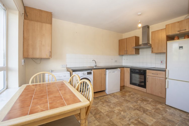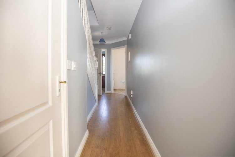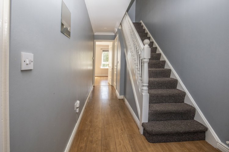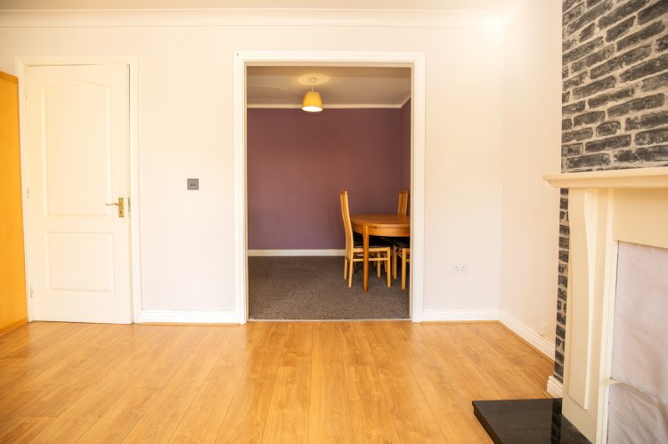 When entering the property, viewers are immediately impressed with the bright entrance hallway with laminate flooring and neutral grey colour scheme, this leads you to the downstairs WC, separate kitchen and living area. The kitchen area, located to the front of the property, is fitted out with integrated appliances and with bright white tiled splashback, laminate wood style cabinetry and laminate counter space this is perfect for the potential purchaser to add their own design and upgrades. The living area, to the rear of the property, is a large light flooded space with laminate flooring throughout and with archway access to a potential dining or at home office area, the fireplace and surround allows a real cosy feeling perfect for those cold winter evenings.