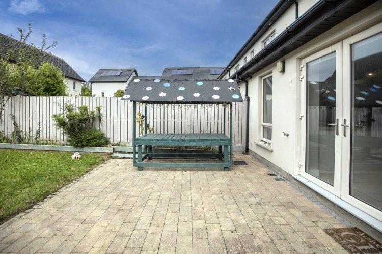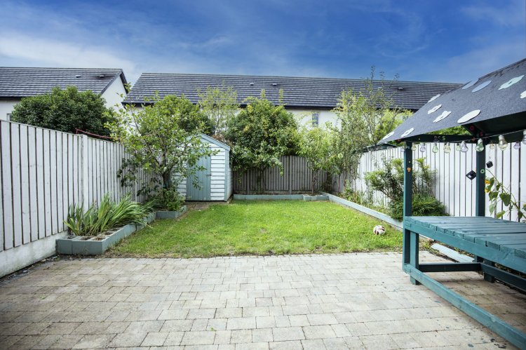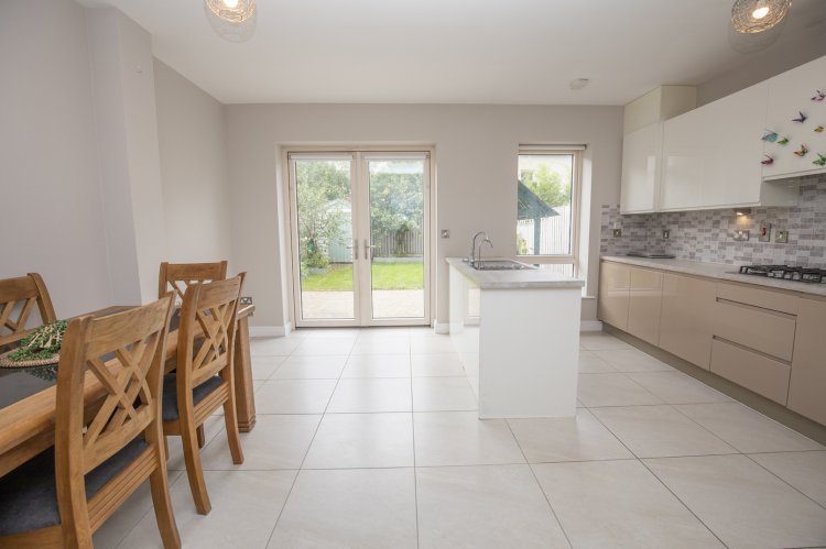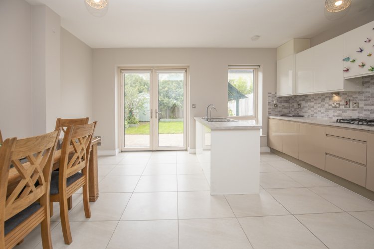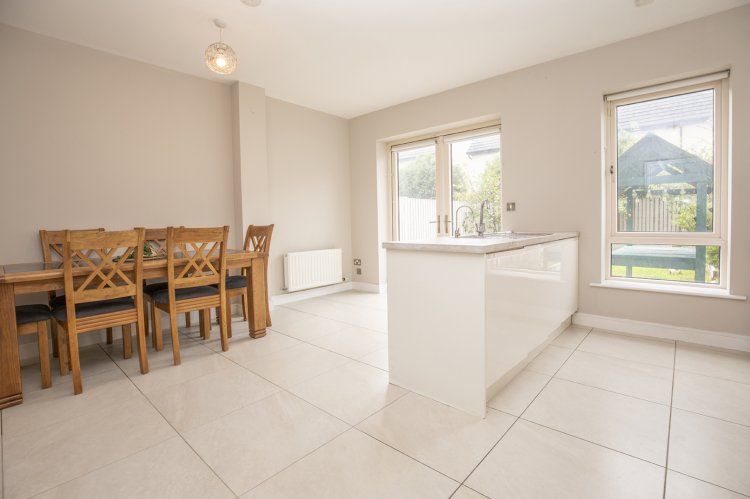 The kitchen/dining space is fully fitted out with modern integrated appliances and with the neutral colour, it is perfect for the purchaser to add their own design. It’s laminate cabinetry, ample counter space offers a simple yet modern design. There is a large utility/storage area off the kitchen where the tiling continues throughout. Just off the kitchen through the double doors the property offers a manicured spacious westerly garden with cobble patio perfect for all your outdoor needs in the spring/summer season.