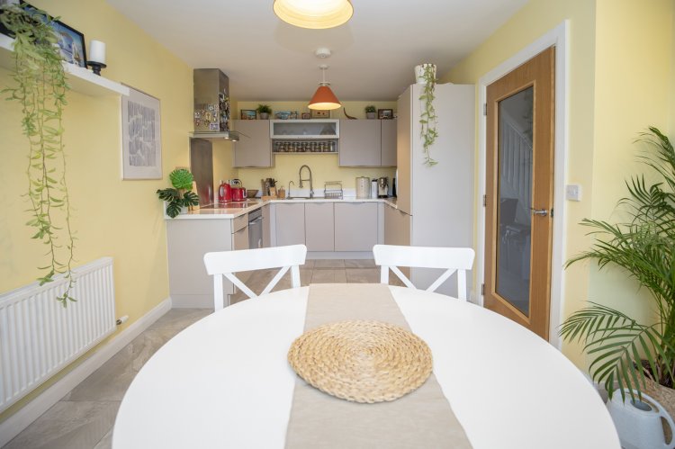 Beginning at the ground level, viewers enter the property through an entrance hallway, decorated in a simple yet modern colour scheme, featuring beautiful wooden grey laminate flooring throughout, grey carpeting on the stairs, modern and clean paintwork and notes of colour in the owner’s art pieces. To the left of the hallway viewers enter the modern kitchen, located to the front of the property, with its sleek stone colour cabinetry, modern integrated appliances and tiled flooring. To the front of the kitchen within the bay window is the dining area, the overall colour of yellow lifts the brightness and sunny feeling when entering the kitchen. Leading from the kitchen back through the hallway, viewers will encounter understairs storage and a large downstairs WC, decorated in simple and modern colour scheme from the fixtures to the grey slate tiled flooring. The ground floor accommodation is complete with the large open living room, located to the rear of the property, with south facing views of the well-manicured enclosed garden. Again, this living room is presented in excellent condition, with modern and simple colour tones, perfectly matching that with the tasteful furniture selection in this room. Leading through the double doors, viewers enter the oasis of this property, the private south facing rear garden. The garden space has been simply designed by the current owners to provide extended entertaining space from the internal living area. The planting edging has matured over the years to provide further privacy screening to allow potential occupants peaceful enjoyment of this space all year round.