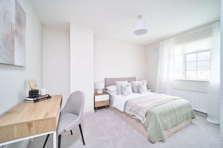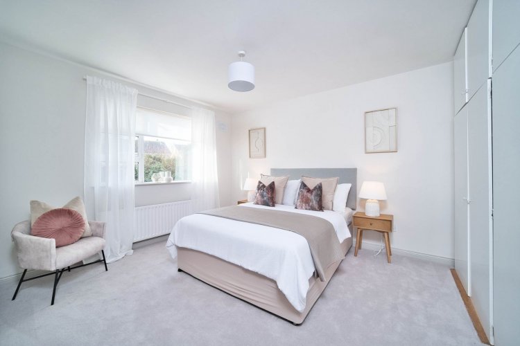 Bedroom 3 (Front) 2.7m x 2.8m Carpet flooring, hanging pendant light, fitted wardrobe and roller blinds