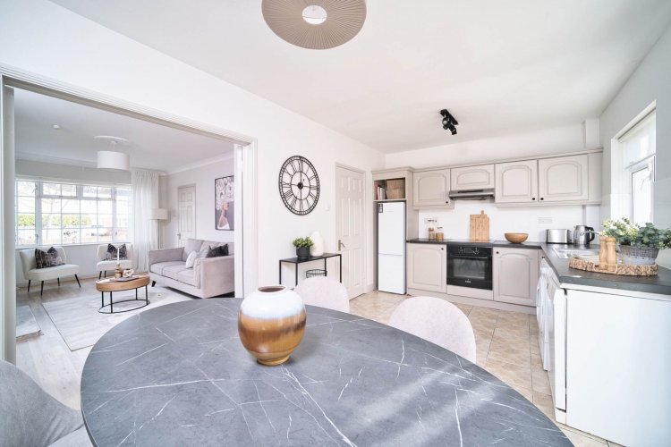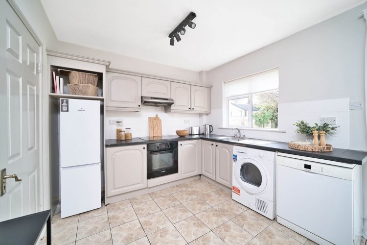 Kitchen/Dining Area 5.2m x 3.1m Tiled flooring, hanging pendant light, light fitting, roller blinds, sliding door leading to rear garden, integrated Bosch oven, Beko hob, washing machine, Bosch dishwasher, stainless steel sink, extractor fan and fridge/freezer.