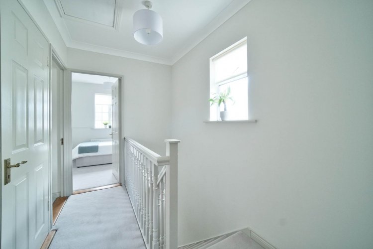 Landing 2.9m x 1.9m Carpet flooring from stairway to landing, hanging pendant light, roller blinds, access to attic via folding ladder and a hot press with wooden shelves.