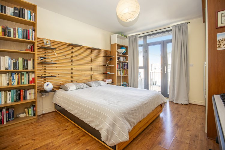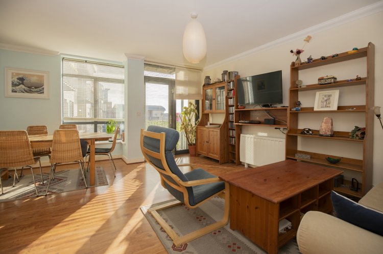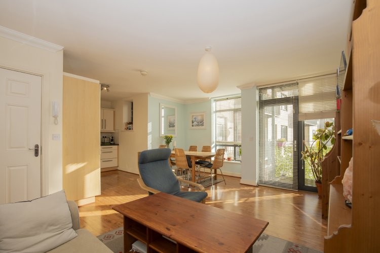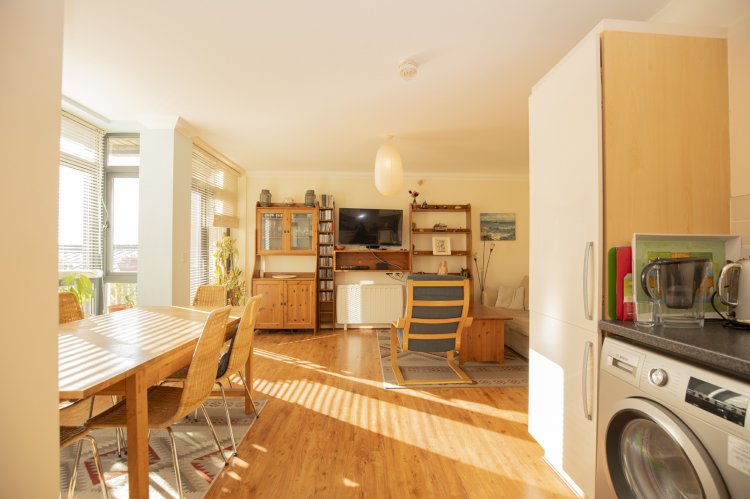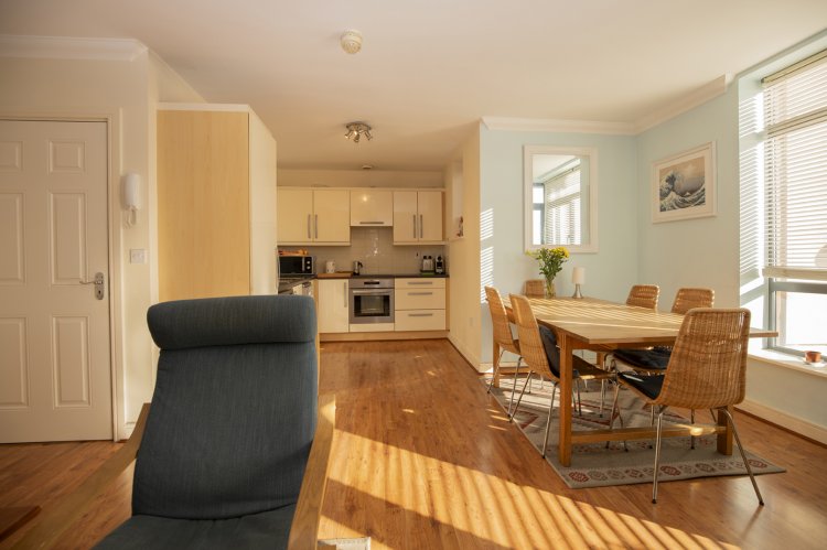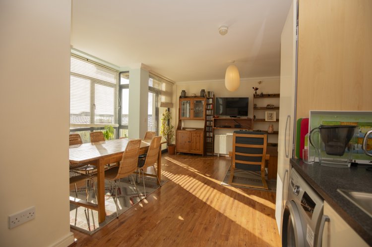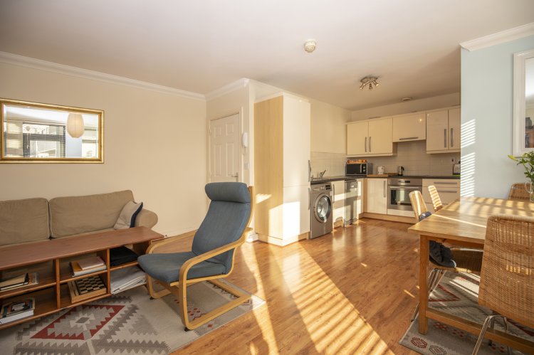 The kitchen/living space is the true showpiece of this property. Benefiting from an easterly aspect, the room is bathed in morning light, complemented by a neutral colour palette and a soft pale blue feature wall that enhances the brightness and sense of space. The modern fitted kitchen comes complete with integrated appliances, cream-coloured cabinetry, and sleek dark countertops – a clean, contemporary design that leaves room for the new owner to add their personal touch.