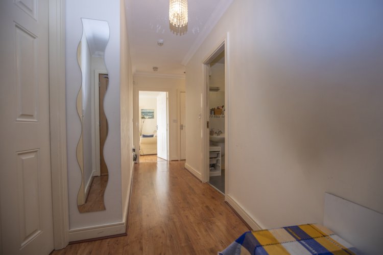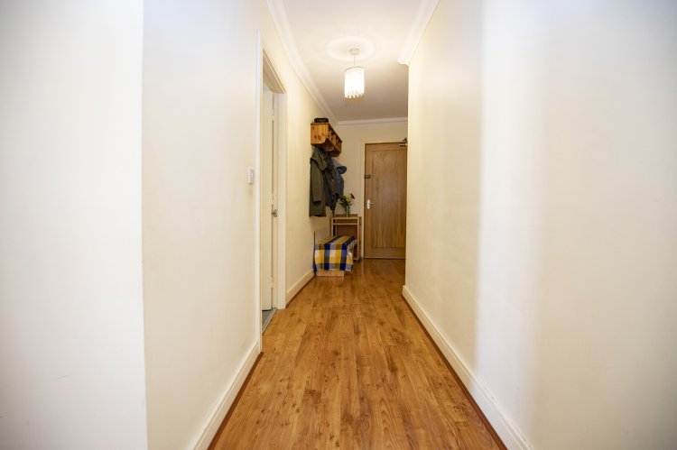 As you enter the apartment, you're greeted by a wide, light-filled entrance hallway, complete with stylish laminate wood flooring that flows seamlessly throughout the living areas. This hallway leads directly to the heart of the home – an open-plan kitchen, dining, and living space – as well as the two well-proportioned bedrooms and main bathroom.