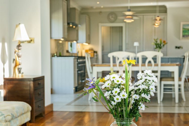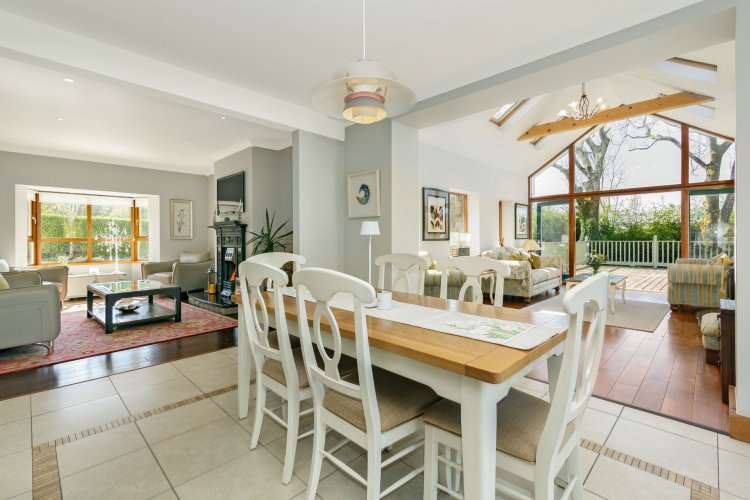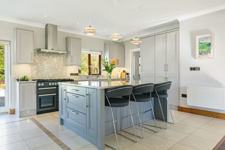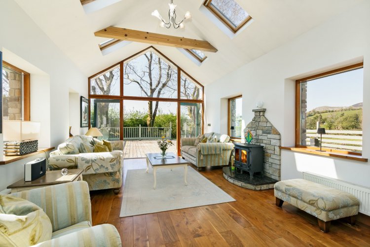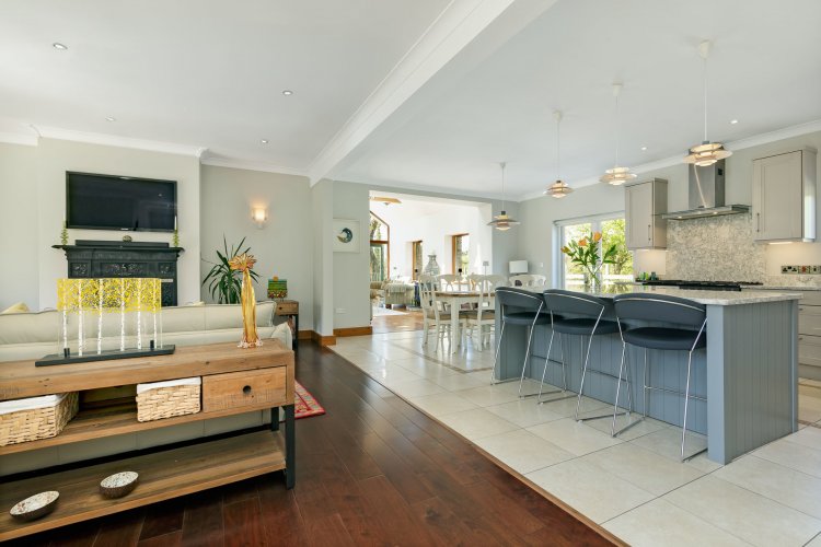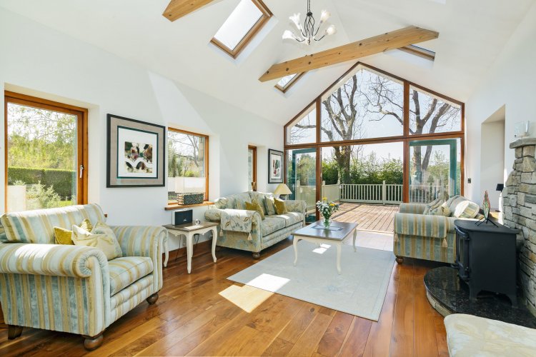 | The kitchen area is finished with a tiled flooring, a bespoke fitted kitchen complete with five ring gas Rangemaster oven together with hot plate and extractor over. The dishwasher which is integrated and the fridge freezer which are integrated are not included in the sale. The kitchen is fully fitted with a central island unit and has granite worktops fitted. Patio doors opening out onto the paved patio area to the rear. The living area is finished with a solid wood flooring and has a gas fire with a cast iron surround fireplace and a bay window feature. 60.74 sqm (653.7 sqft) | | Sun Room