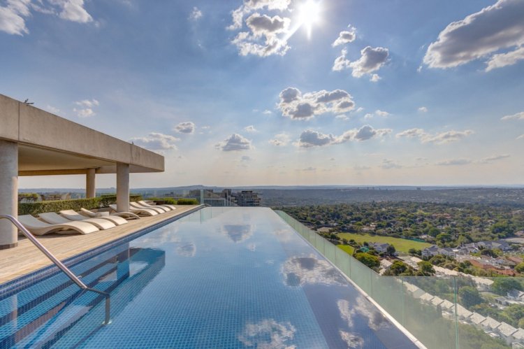 Sky Deck with 25m rim-flow pool and panoramic Sandton views