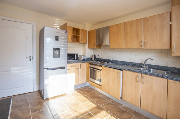 Upon entering the spacious kitchen space, you are greeted with a light flooded room, with south westerly aspect. The kitchen area is fully fitted out with modern integrated appliances and with the neutral colour scheme it is perfect for the purchaser to add their own design. It’s laminate wood style cabinetry offers a simple yet modern design. From the kitchen you are lead to the living area offers spacious and bright room with laminate flooring throughout and through the door the property offers a spacious south westerly facing corner balcony overlooking the green area within the Oaks, Ridgewood estate, the large windows offer a great source of natural light throughout the property.