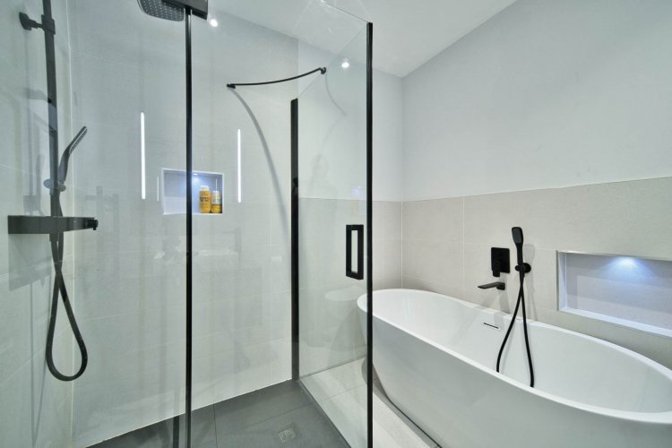 Bathroom 2.25m x 2.53 Tiled flooring, semi tiled walls, oversized shower cubicle with Triton mixer and monsoon shower head, bath, w.c., w.h.b. with built in vanity, recessed lights, fitted heated mirror with lighting and vertical heated towel rail.