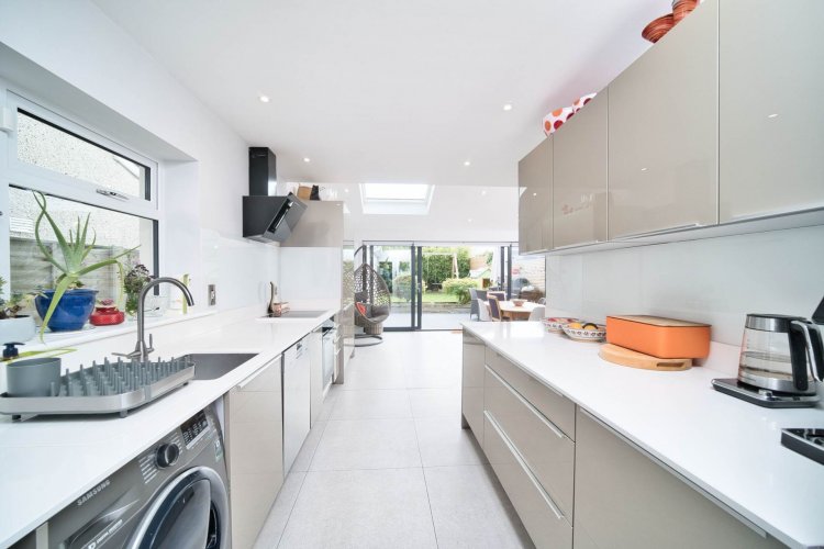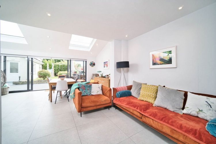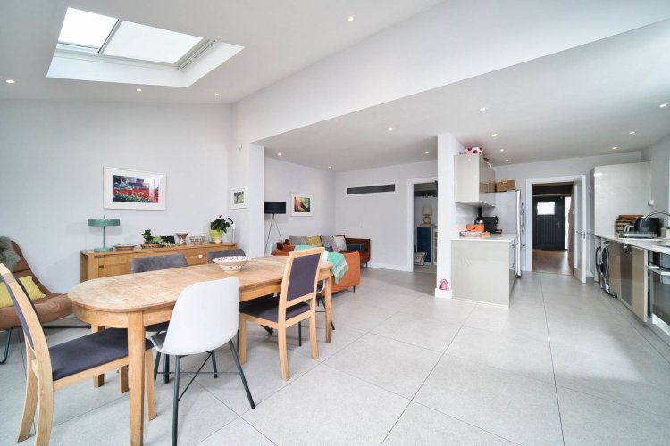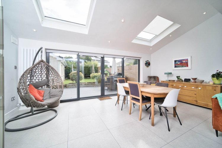 Kitchen/Dining/Living Room 8m x 5.93m Porcelain tiled flooring, high gloss fitted wall and floor units, quartz worktop and upstand, glass splashback, Miele oven, Miele induction hob, extractor fan, two roof windows with blinds, vertical radiator, and large glass sliding doors leading onto decking area.