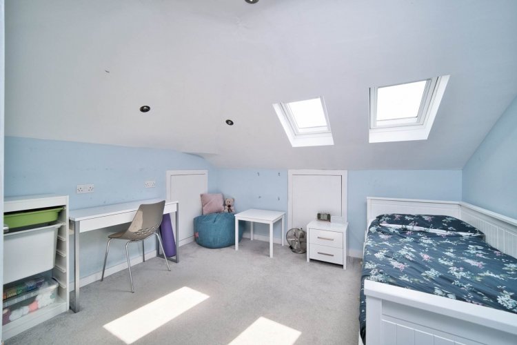 Attic Room 3.71m x 3.36m Carpet, large open room with eaves storage, recessed lights and two Velux window.
