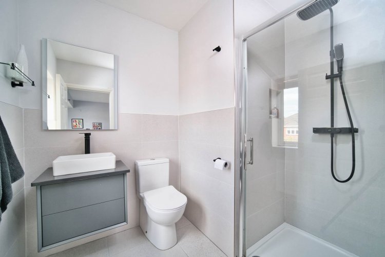 Ensuite 1.93m x 1.44m Tiled flooring, semi tiled walls, oversized shower cubicle with Triton monsoon shower, integrated toiltries shelf, w.c., w.h.b. with built in vanity, fitted heated mirror with lighting, recessed lights and extractor fan.