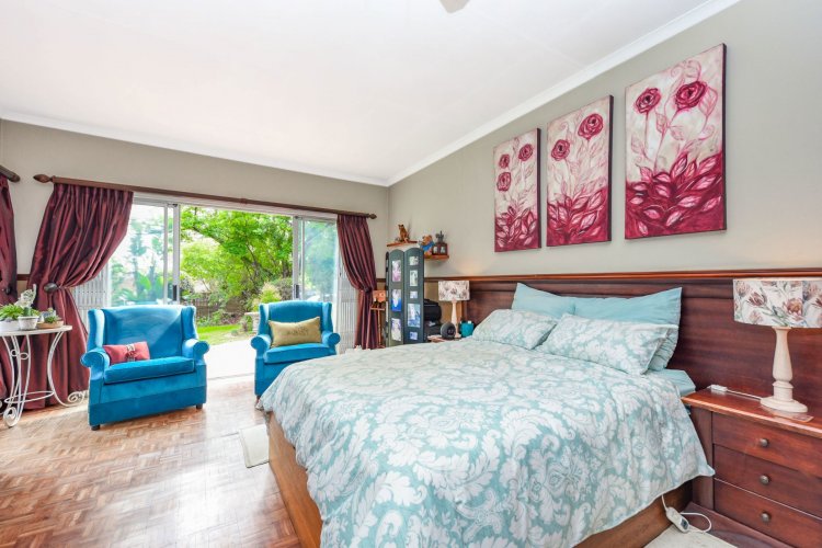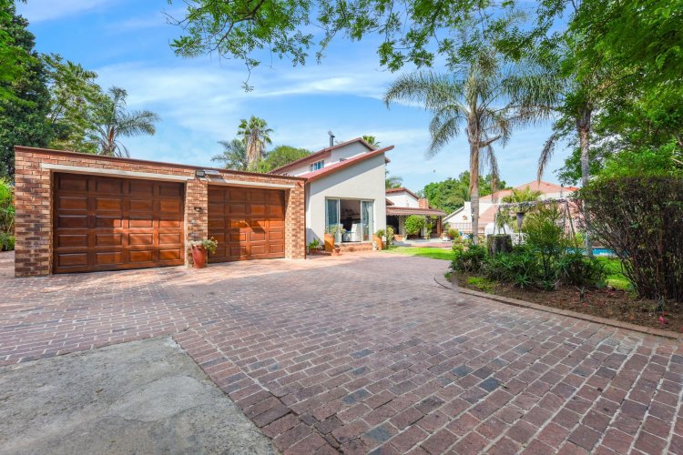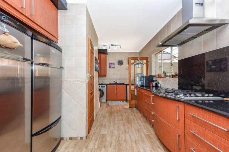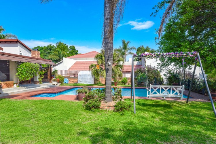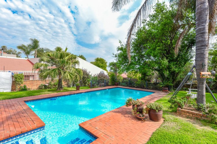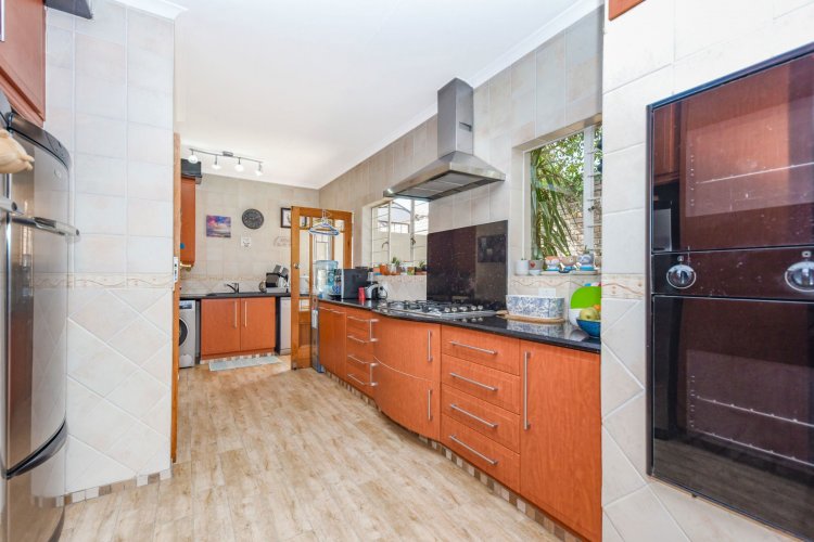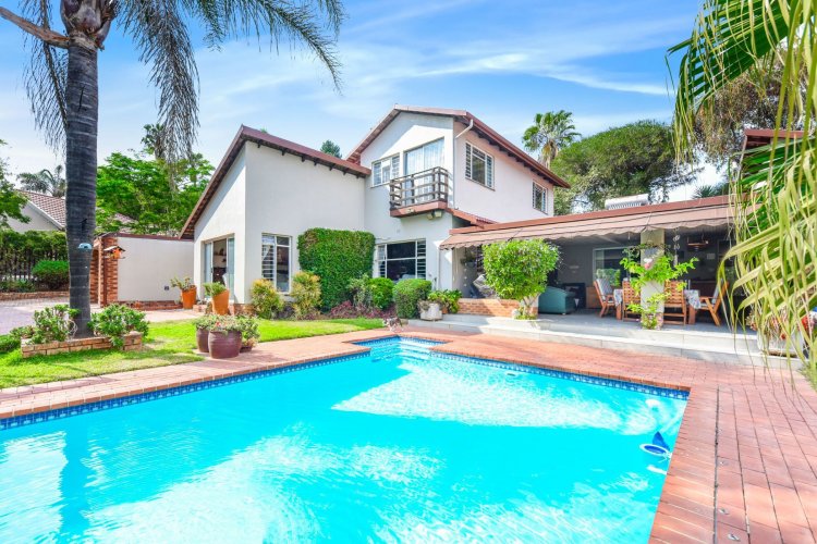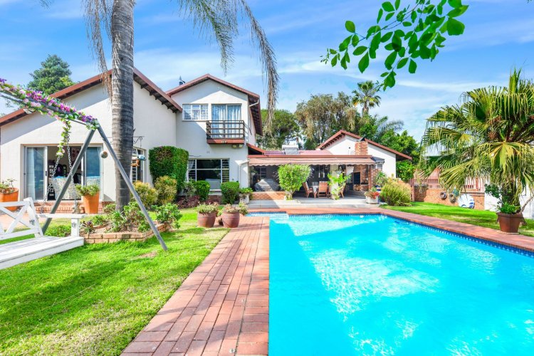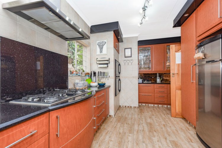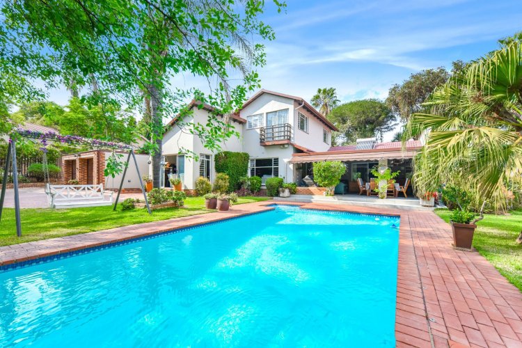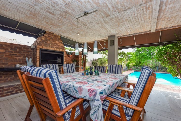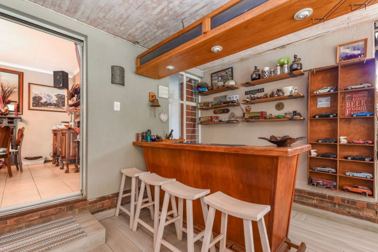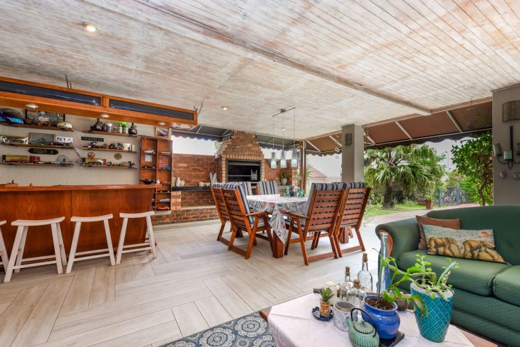 The heart of the property is its entertainers' patio, complete with a fitted bar and built-in braai — a space designed for gathering with friends and family while overlooking the sparkling pool and lush, established garden. The kitchen boasts a gas hob and double door fridge space with the scullery offering room for 3 appliances and a bar fridge.